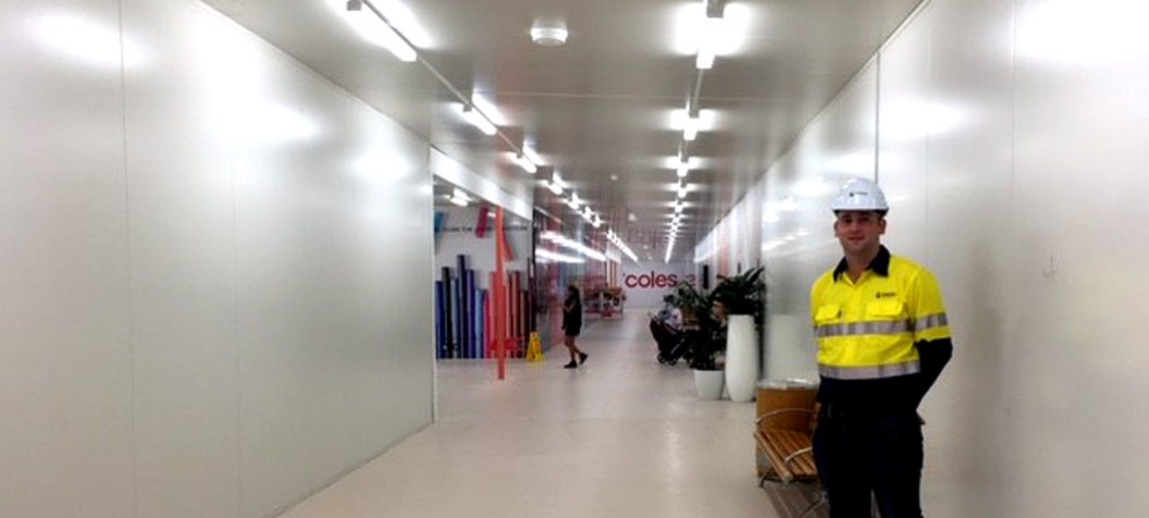Supply and installation of a 165 metre long temporary shoppers access tunnel constructed with Bondor EPS wall and solar span roof panels. Miscellaneous structural hoardings dividing the existing shopping centre and the new redevelopment works. Supply and installation of a feature green wall including custom fabricated and polished ply panels lining the walls adjacent to the travellator.